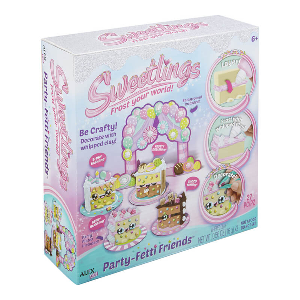Sweetlings Party-Fetti Friends comes with everything you need to Frost Your World and bring 4 adorable Sweetlings characters to life! Use whipped clay icing to layer and frost 4 plastic mini-cake slices and add some accessories to create a one-of-a-kind Sweetlings look. Each tube of whipped clay icing has a star shaped decorating tip and cap. With leftover clay you can decorate your festive party plates and background. Create B-DAY BASHling, FROSTY DREAMling, CHOCO FUNling, and BERRY BLASTling.