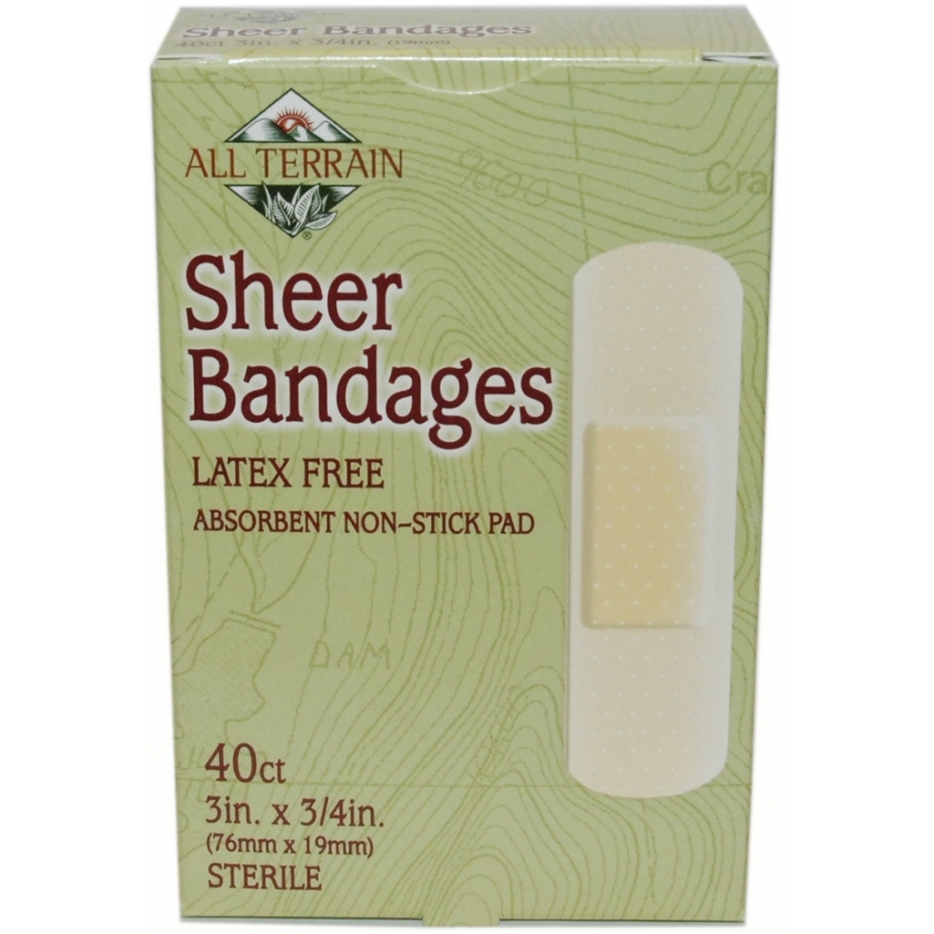 Sheer bandages. Contain 40 bandages. Latex Free. Made with recycled/recyclabe PVC plastic. Absorbent non-stick pad. 100% Sterile.