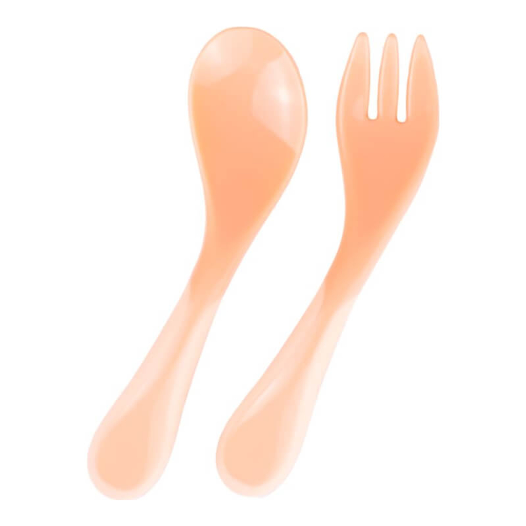 Our baby learner fork and spoon set is a great starting point. The short, chunky handle is great for little hands to get a good grip. The ergonomic curve helps with navigation to mouth as it leads the way around. oh, and did you know...they are also small enough to fit inside our popular portable plate the EasyMat Mini for easy transportation for meals out.