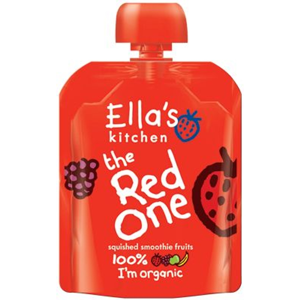 100% squished strawberries, raspberries, apples + bananas with a dash of lemon juice. Just an organic Smoothie fruit snack, with nothing else added, not even water. It contains 1 of the 5 lovely pieces of fruit and veg recommended each day!