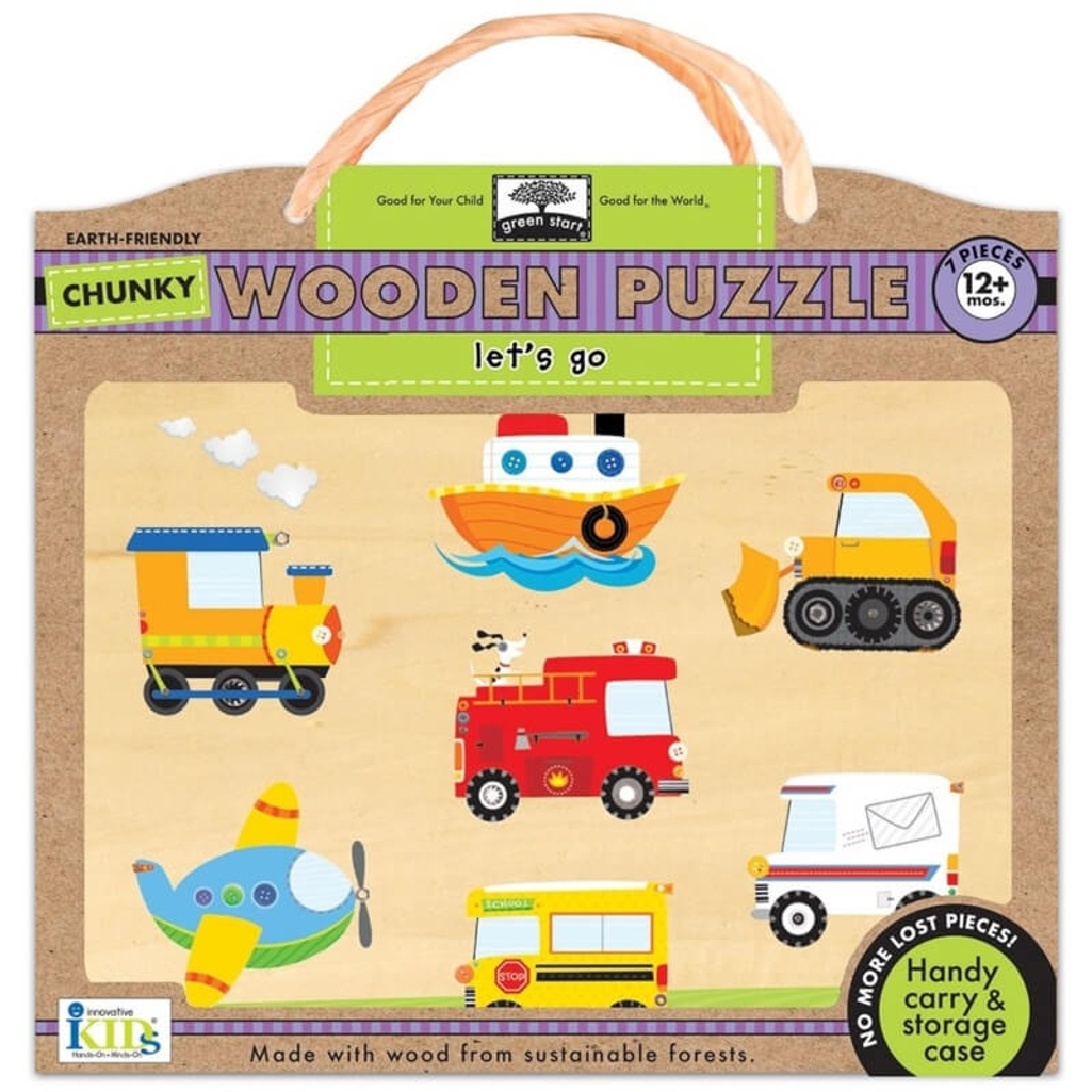 Green Start Chunky Wooden Puzzle - Let's Go: Seven vehicle pieces with fun colors and patterns are self-correcting so they can fit back into the one correct spot. The same image is printed in the well for one-to-one matching.