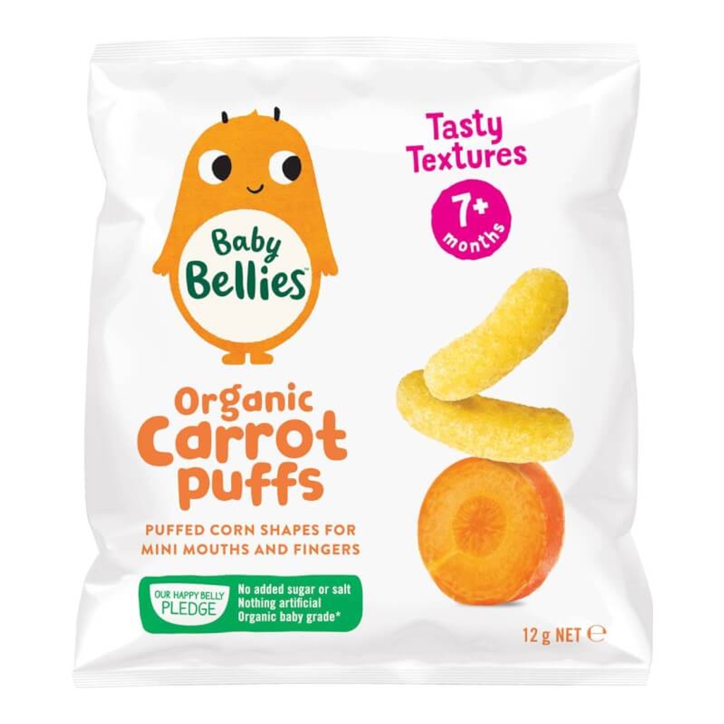 Baby Bellies Organic Carrot Puffs are deliciously crisp organic corn puffs with carrot. These delightful baby snacks melt in the mouth for safe self-feeding. Ideal for first stage snacking.