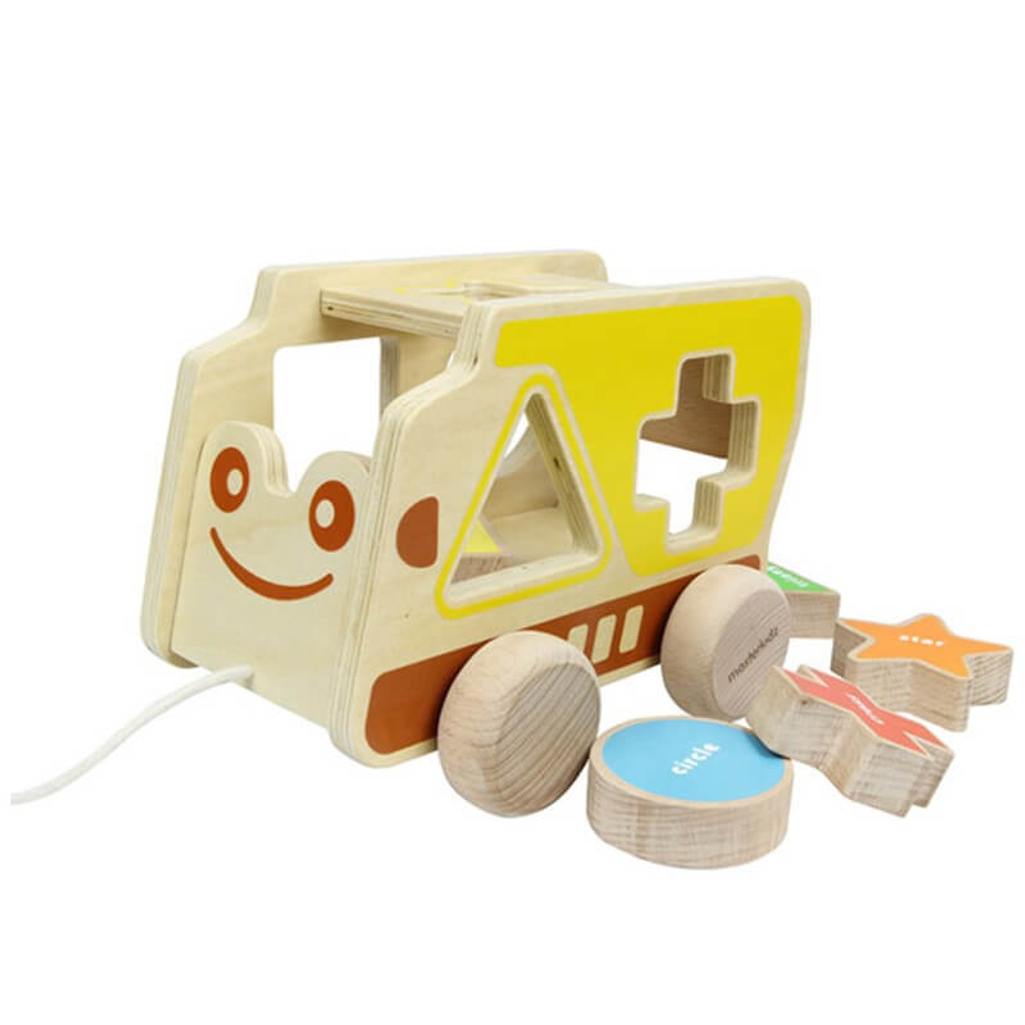 A Scandinavian style wooden Pull Along Shape Sorting Truck is an exciting update on the classic toy. Toddlers can drop wooden shapes (triangle, ellipse, star, square trapezoid, cylinder) through the matching holes, then open the lid and take them all out to start again.