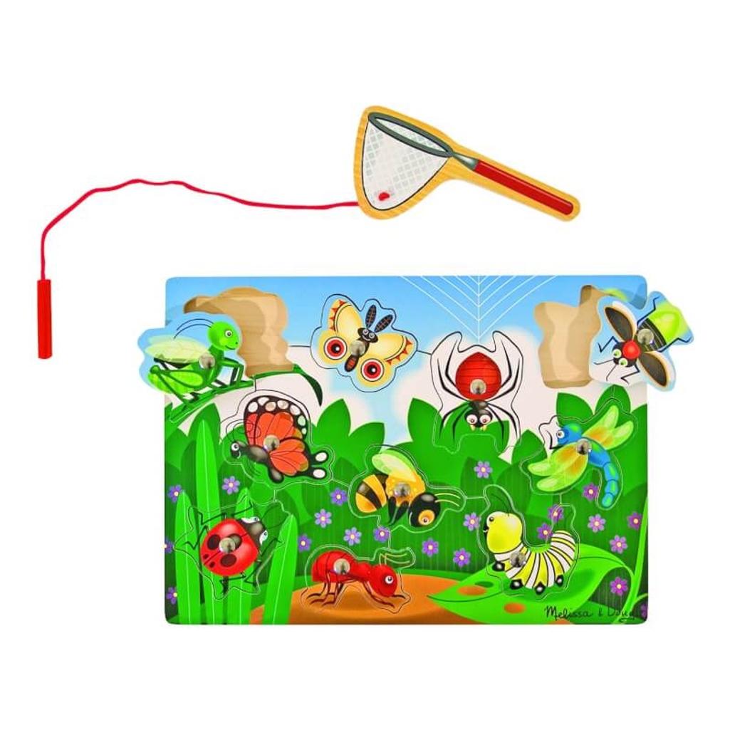 This magnetic wooden puzzle game features a garden full of attractive bugs and insects! Use the magnetic butterfly net to "capture" the 10 bug buddies from the game board. Then enjoy the challenge of returning them to their preferred perch!