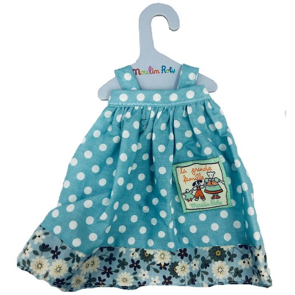 Introducing the Moulin Roty La Grande Famille Dress, specially designed for the adorable Little Jeanne the Goose! At 30cm, this charming dress features delightful polka dots in a lovely shade of blue that has made Jeanne a cherished favorite at Cottontails Baby.
