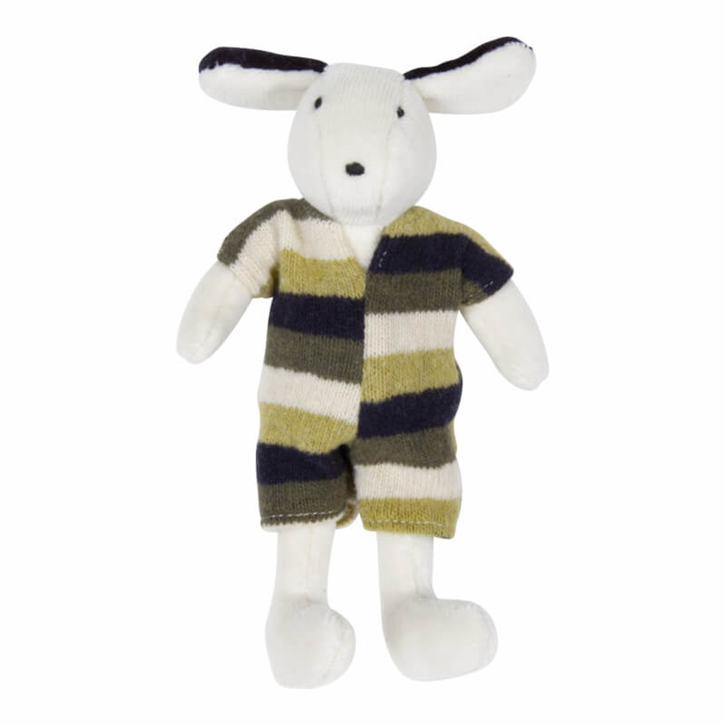 A small white and black dog dressed in green, black and white stripes. Its small size is ideal for baby's hands. Can be completed by other animals for the same collection La Grande Famille.