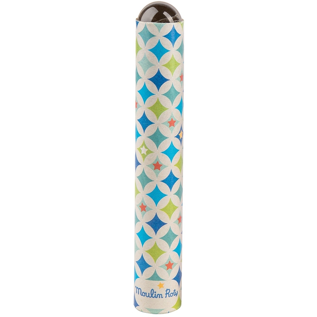 A cardboard tube decorated with colourful diamond patterns, fitted with a magnifying glass at one end. Put it to your eye and turn the tube, the magnifying glass and the little mirrors inside increase and multiply whatever you look at, creating a succession of different shapes and colours.