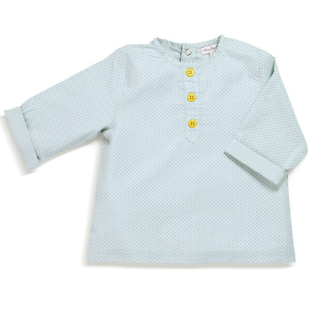 Elevate your child's wardrobe with the Moulin Roty Les Tartempois Malek Blue Polka Dot Shirt. Practical, stylish, and designed for comfort, it's the perfect choice for a fashion-forward and happy little one.