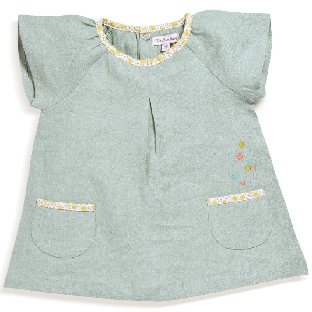 Elevate your baby's style with the Moulin Roty Les Tartempois Mona Blue Pinafore Dress – a perfect blend of timeless charm and comfort for your little fashionista.