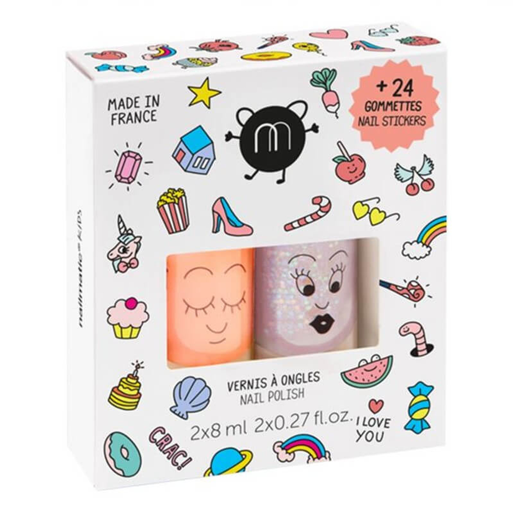 Introducing the nailmatic Kids Nail Polish + 24 Stickers Set – Flamingo/Polly, a delightful box of two vibrant nail polishes specially crafted for little ones, making nail art a fun and hassle-free activity! With neon coral Flamingo and glitter pink Polly shades, plus 24 charming nail stickers, this set is a perfect blend of creativity and play.
