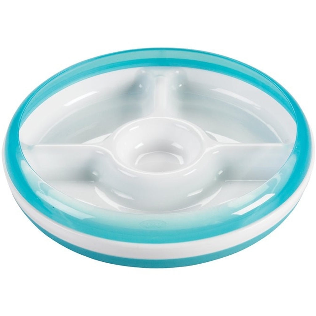 Portions food and keeps it on the plate. Three sections allow for neat eating and balanced portions of protein, veggies and grains, and a center sauce section promotes fun dipping. Features: Removable, raised plate ring when child has mastered self feeding Plate ring helps keep food contained and assists when using utensils Non-slip base Age: 6+ months BPA, Phthalate and PVC free Top rack dishwasher safe and microwave safe Dimensions: 8.5"" x 1.5"" x 11""