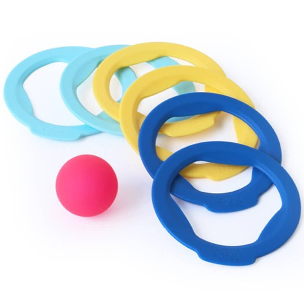 6 colorful light-weight rings and a small ball equals endless gaming possibilities.