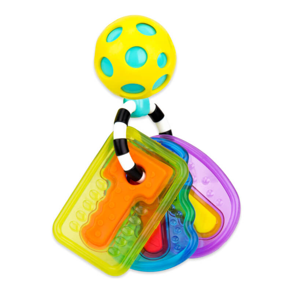 The Drive & Drool Keys put baby in the driver's seat! A rattling polka-dot ball makes for an engaging key chain and offers a fun rattling sound. The use of contrasting colors, different materials, and variety of surfaces help stimulate baby. The soft, squishy material is perfect for baby's environment, and is dishwasher safe, too!