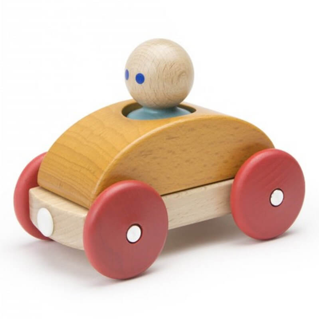 1 year & up. Get ready to roll with this colorful, magnetic wooden racer by Tegu. Car features magnetized bumpers so you can form a car train and 3 magnetic parts that make it fun and easy to mix and match with other racers. Available in Poppy, Orange, and Teal. Each car includes a removable chasee, wheels, and driver.